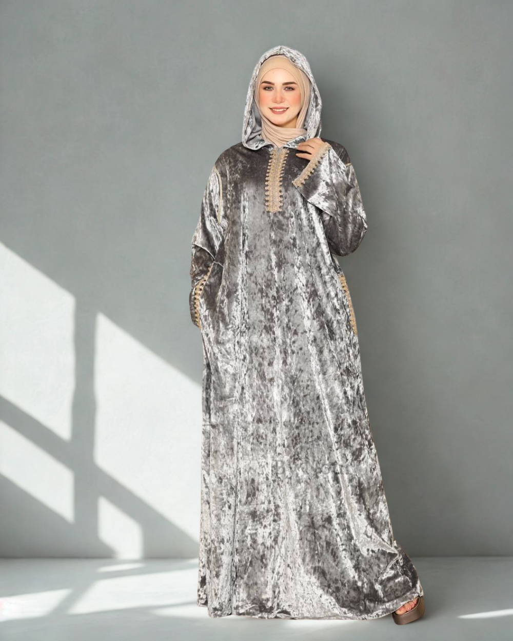 عباية مغربية أنيقة من سدرة بتفاصيل تجمع بين الأصالة والرقي. مصنوعة من خامة قطيفة فرنسي فاخرة بأعلى المواصفات، تمنحك ملمس ناعم ولمعة راقية تعكس جودة الخامة وأناقة الإطلالة.