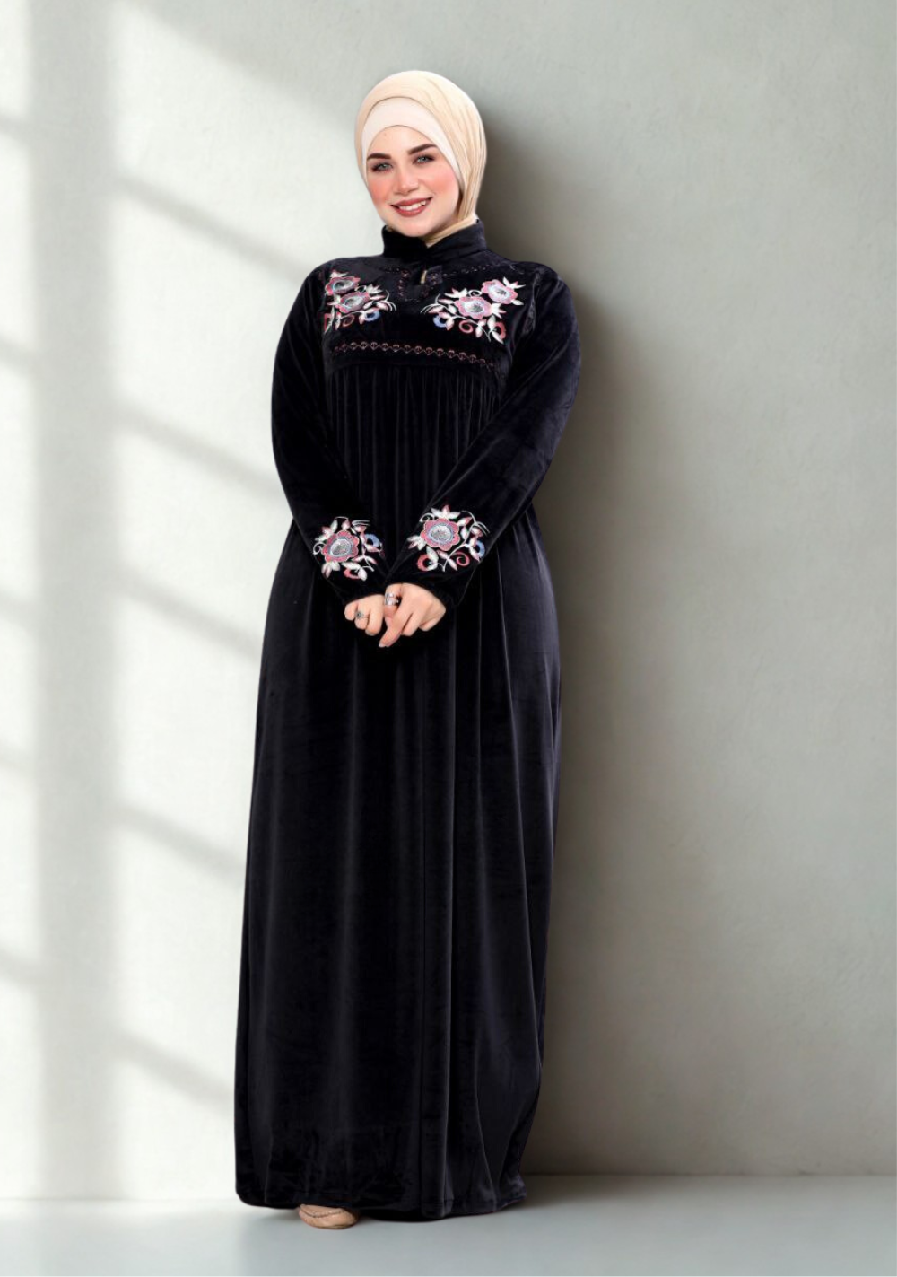 موديل أنيق وعصري يجمع بين الدفء والرُقي، مصنوع من خامة قطيفة هايدي وجهين، أي قطيفة من الوجه والظهر، ليمنحك إحساسًا مضاعفًا بالنعومة والفخامة. مزين بتطريز ناعم يضفي لمسة فاخرة على التصميم.