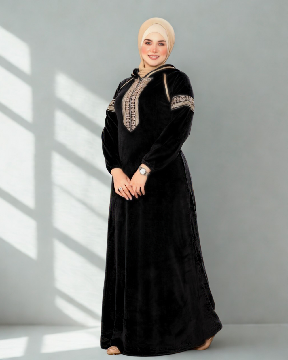 إطلالة تجمع بين الأناقة والفخامة بتفاصيل بسيطة لكن مميزة. مصنوع من خامة قطيفة هايدي وجهين، أي قطيفة من الوجه والظهر، تمنحك ملمس ناعم ولمعة راقية من كل جانب. مطعّم بشريط هندي أنيق يضيف لمسة من الأصالة والتميز للتصميم.