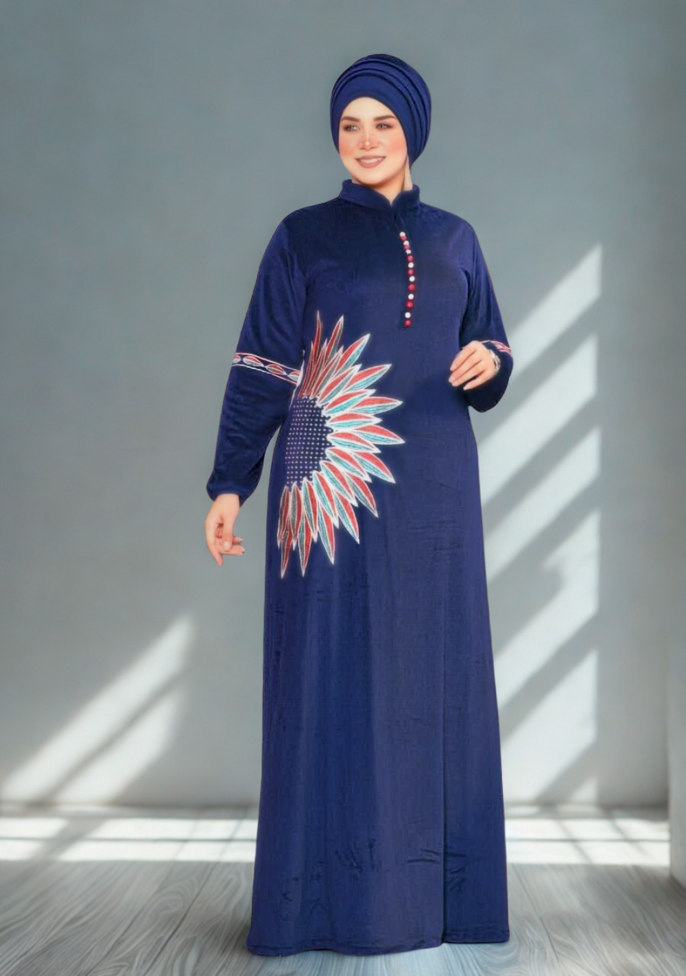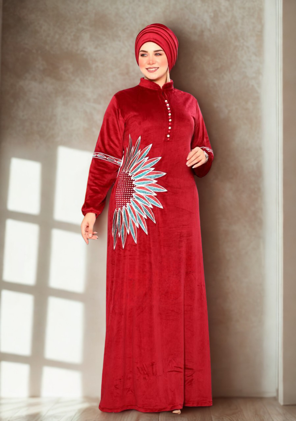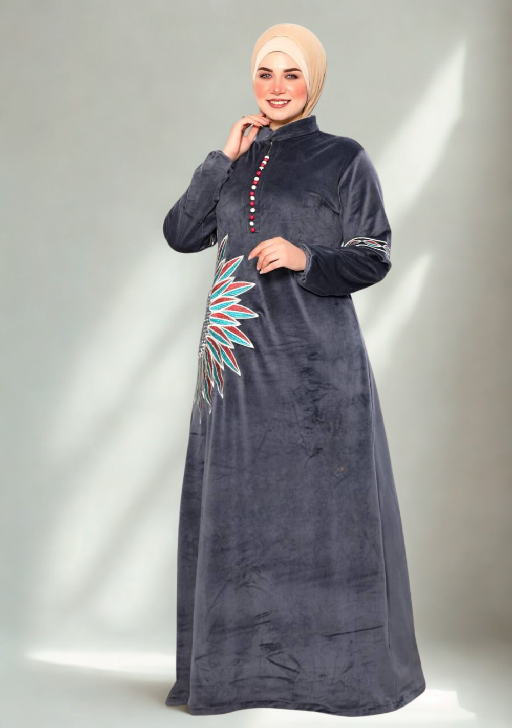 تميّزي بإطلالة ناعمة ومختلفة مع تصميم جديد من سدرة، مصنوع من خامة قطيفة هايدي وجهين، بملمس قطيفي فاخر من الوجه والظهر. مطعّم بإكسسوار هندي وشريط هندي أنيق يضفي لمسة شرقية مميزة على الموديل.