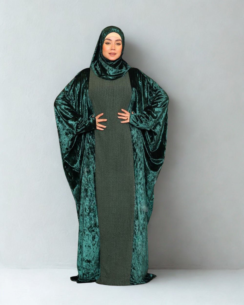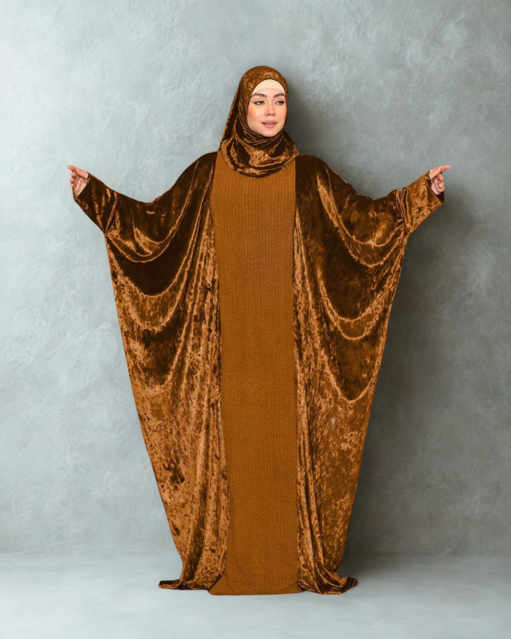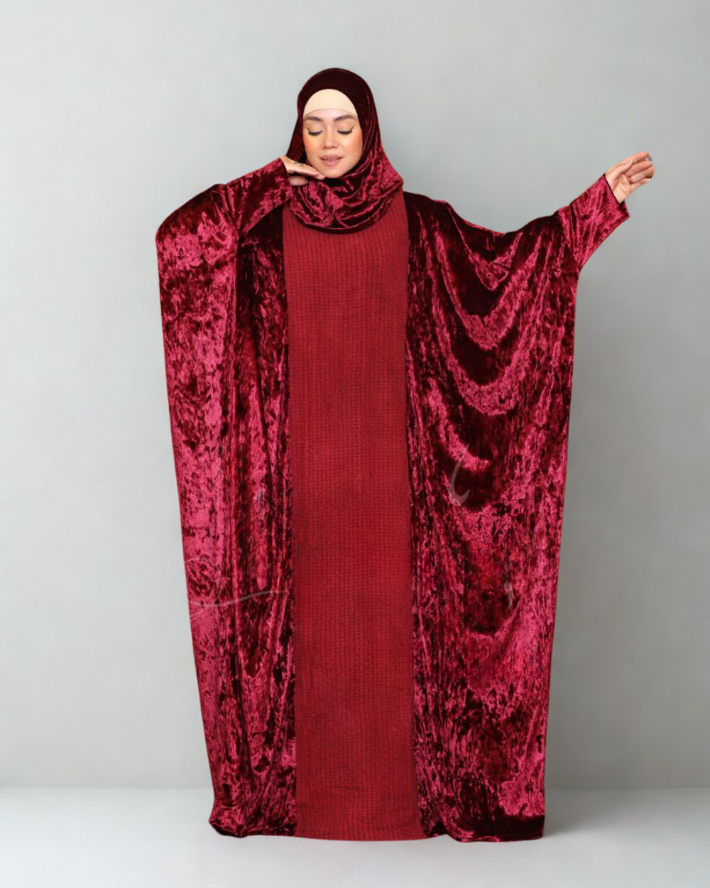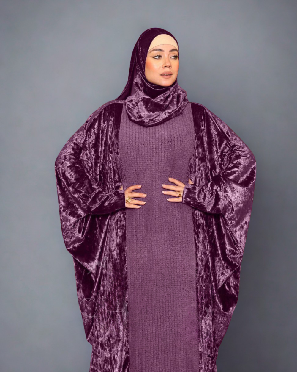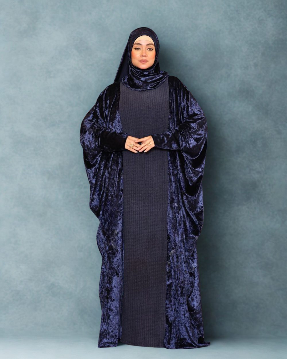 يأتي بطرحة متصلة عريضة وطويلة تضيف مظهرًا محتشمًا وأنيقًا في آن واحد.
