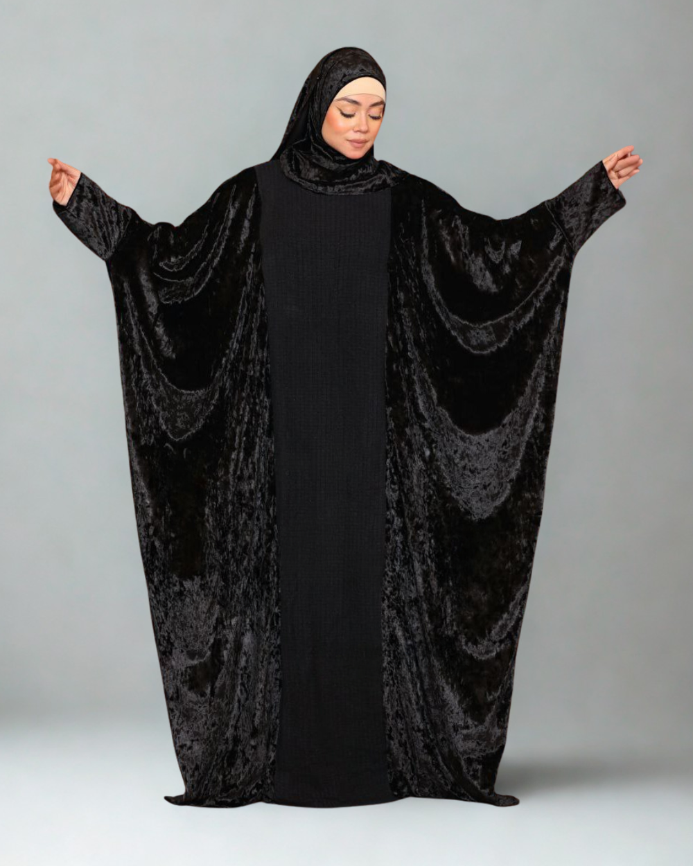 إسدال ملحفة جديد من سدرة بتصميم أنيق يعكس الرقي والتميز. مصنوع من خامة قطيفة فرنسي جنجا مستوردة تُعد من أعلى وأفخم خامات الجنجا، بملمس ناعم ولمعة راقية تضيف لإطلالتك لمسة فخمة.