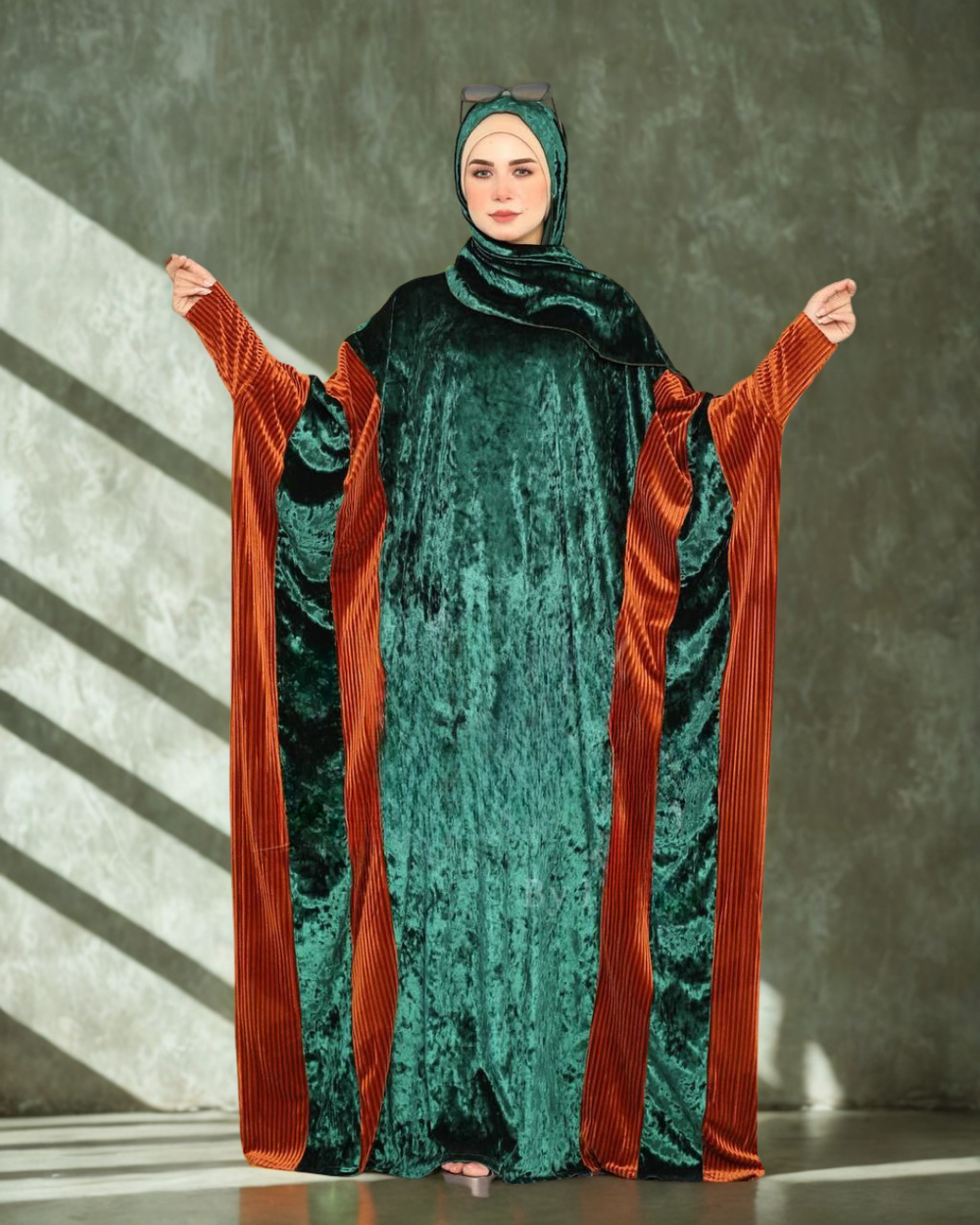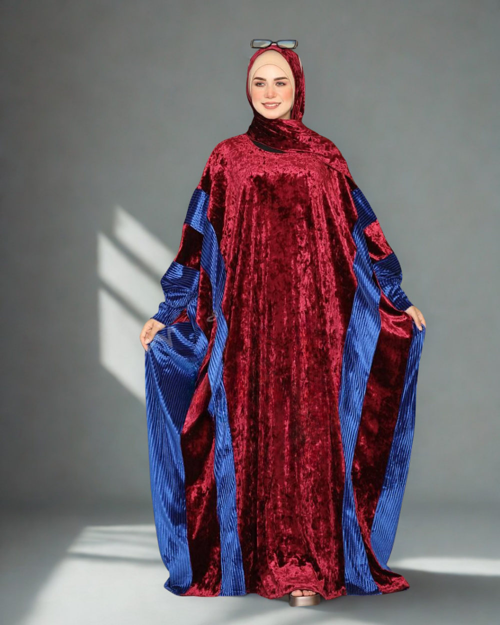 مطعّم بقماش قطيفة مقلم يضفي لمسة أنيقة وفريدة على التصميم، مع طرحة متصلة تمنحك إطلالة متكاملة بلا مجهود.